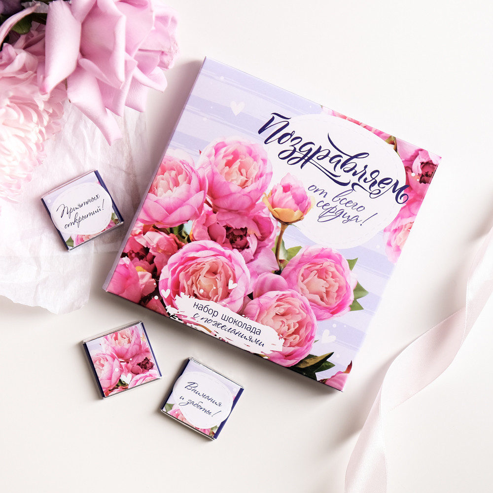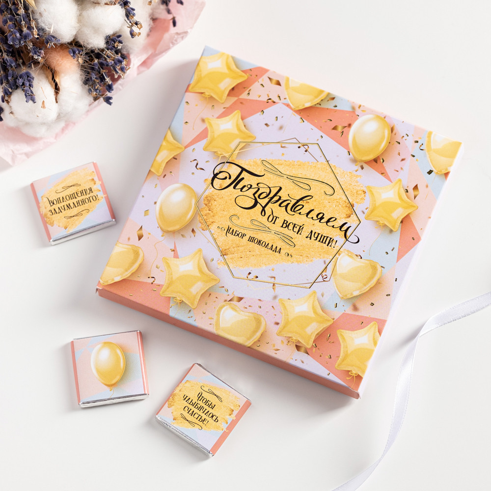 Набор с 9 молочными шоколадками, где каждая плитка завёрнута в красочную этикетку со своим индивидуальным дизайном и приятным посланием.